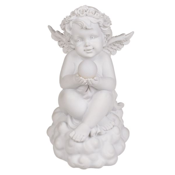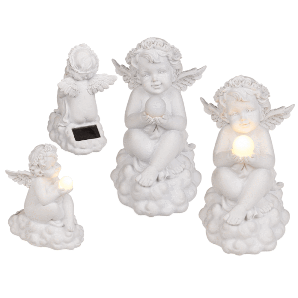 Polyresin angel sitting on cloud, with LED ball & solar panel + additional battery pack, ca. 11 x 17 cm Resin angel