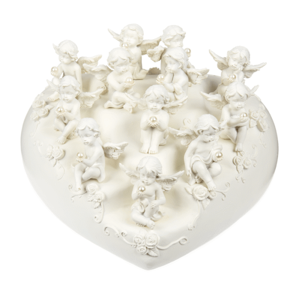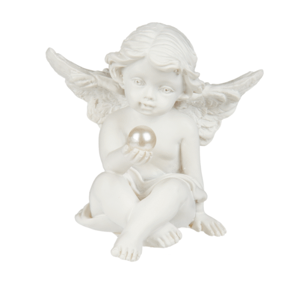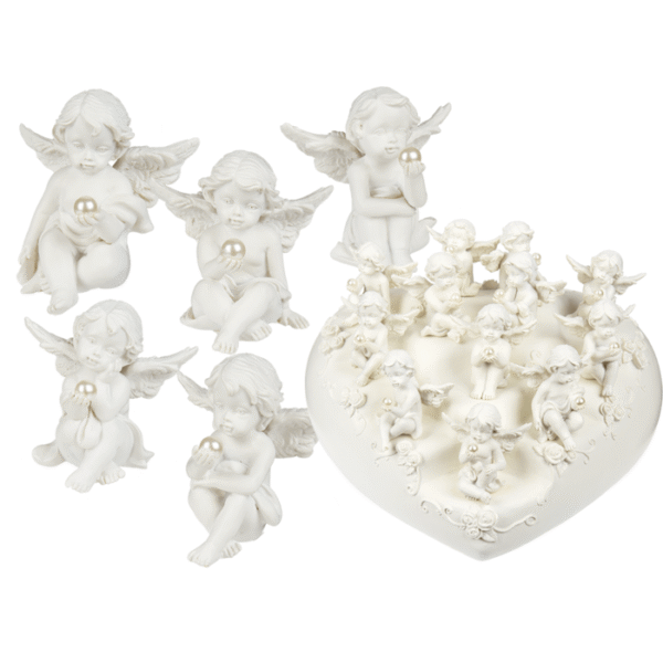 Polyresin angel with pearl, ca. 5 cm, 12 ass., 96 pcs. & 1 heart display – The lovingly designed angel figurines exude a calm and secure feeling, which come into their own excellently as a decorative element. The heavenly companions in polyresin leave a positive effect in the environment and make an excellent gift straight from the heart. These sitting angels have a comfortable size of approx. 5 cm which makes them perfect for hostess gifts, such as christenings and weddings. Angel figurine