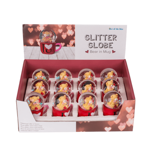 Polyresin glitter globe, bear in mug, I love you, ca. 7 x 6 cm, 12 pcs. per display – This small but extremely charming object will perfectly find its special place in the heart of your loved one. The detailed glitter ball with a polyresin bear in the middle helps you to put a smile on your partner’s face and becomes a real eye-catcher as a decoration in your home. The globe on the cup shaped base has a size of approx. 7 x 6 cm. Glitter Globe