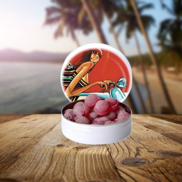 Offer a refined experience with our 70mm round metal box, filled with delicious natural poppy candies and adorned with the artistic visual of Franois Groslire.
