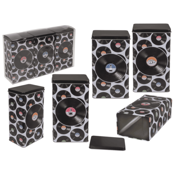 Rectangular tin box, Coffee, Tea & Sugar, Vinyl Record Design, 11 x 7,5x 19 cm, set of 3 pcs. in plastic box – Container Storage Kitchen Tin Canister