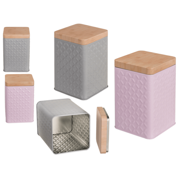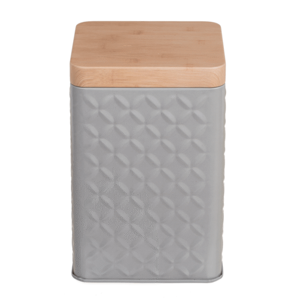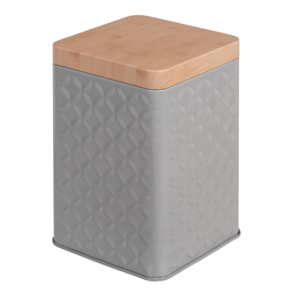 Rectangular tin box with bamboo look cover, ca. 10,7 x 16 cm, 2 colors ass. – The storage box in modern Skandi design can become the new home for many things. The bamboo-look lid gives the box a natural detail. The tin is ideal for storing dry food such as coffee pads or tea bags and keeping them fresh. In this way, the metal storage convinces not only with its functionality but also with its appearance and the associated ability to function as a decorative element in an open kitchen. Tin box