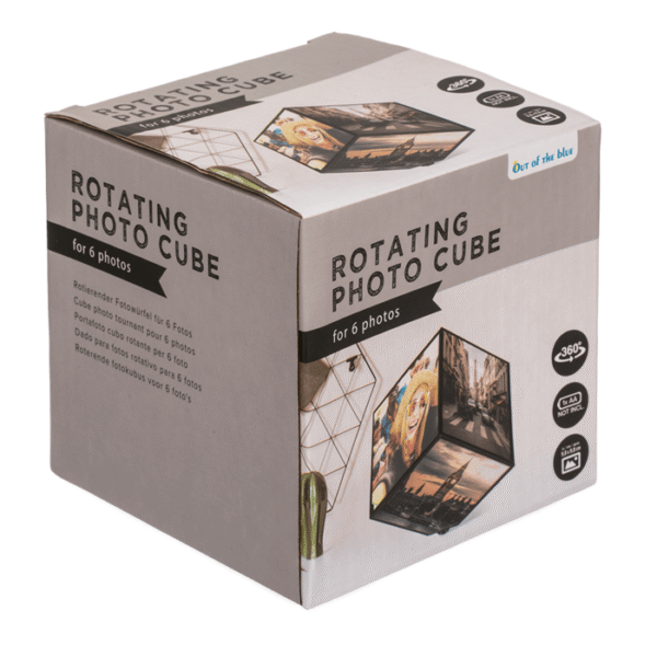 Rotating picture cube for 6 photos 11 x 11 cm, for 1 mignon battery (AA) – With the cube, you no longer have to decide which picture you want to hang in this one frame. Instead, you can have 6 at once! Thanks to the rotating system, the cube starts to spin and therefore turns all the photos to the front. The cube is powered by an AA battery, which is not included. Photo cube