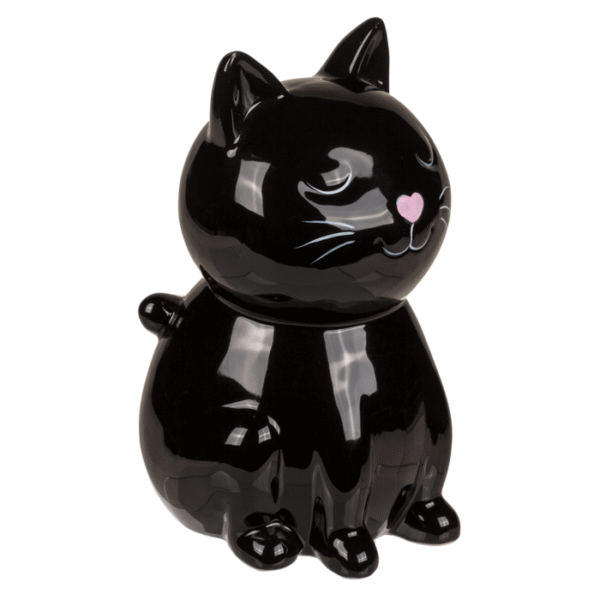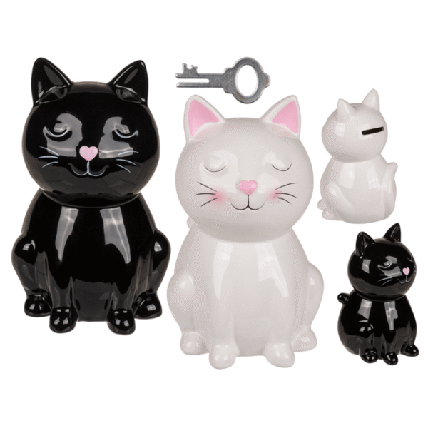 Savings bank with lock, Cat, ca. 16 cm, ceramic, 2 colours ass. – This lovely money bank encourages everyone to put in a few coins, which are then safely stored in the kittys tummy. The coin slot is on the back of the cat and to get your savings out, you only need the supplied key and you can unlock your money box at the bottom. Piggy bank