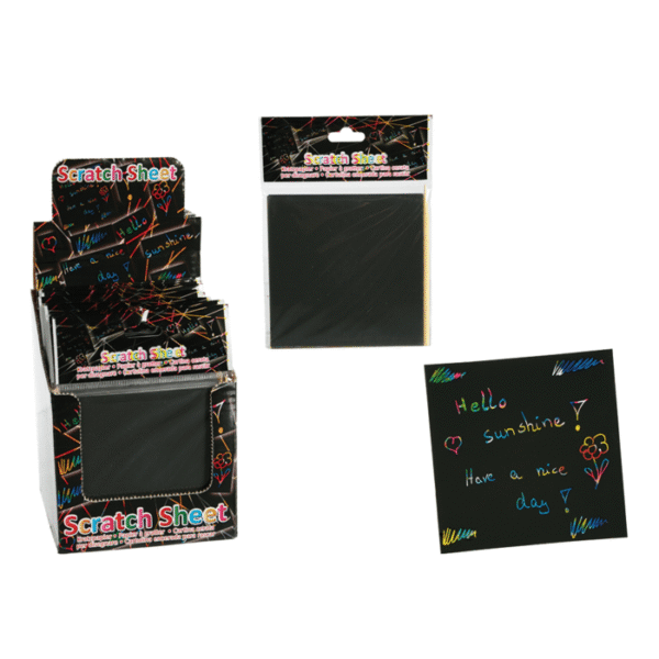 Scratch Sheet, Colourful, ca. 8, 5 x 8, 5 cm, 24pcs. with plastic pen in polybag with headercard, 24 pcs. per display – The scratch paper is perfect to let your imagination run wild. Each polybag contains 24 sheets waiting to be worked on with the plastic scratching stick provided. Whether as a greeting card or a small DIY decoration project, the colourful scratch paper can be quite versatile! Scratch Pad
