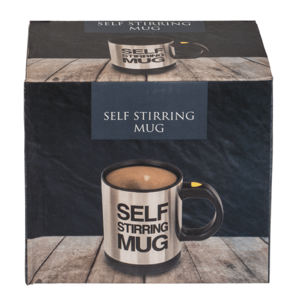 Self stirring mug, stainless steel with plastic, ca. 11 x 9 cm, for 2 micro batteries (AAA) in gift box – Never look for a spoon again: The stainless steel cup with plastic does the stirring all by itself. The propeller in the bottom of the cup ensures that the drink is always stirred evenly, saving stress and time. The mug is powered by two AAA batteries, which are not included. The batteries are attached to the bottom of the cup. Self-stirring