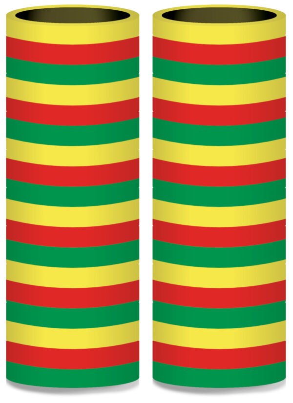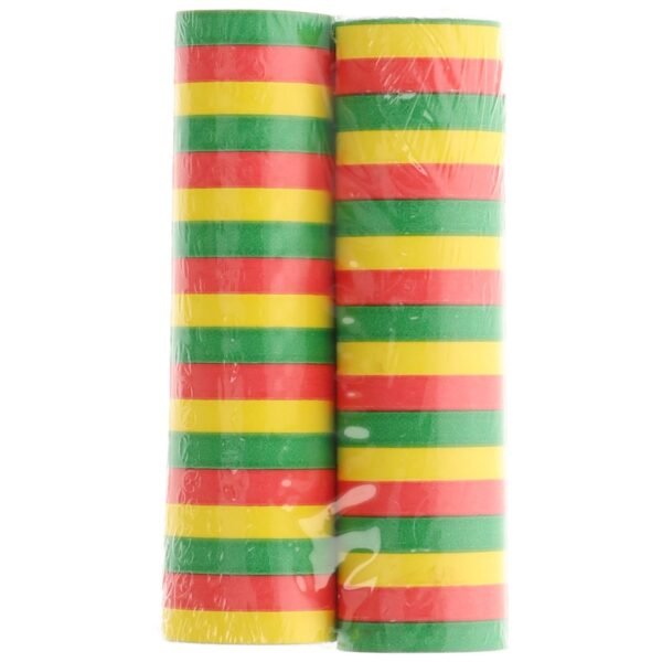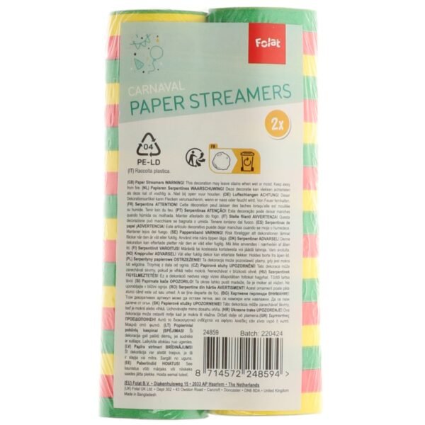 Serpentines Red-Yellow-Green 4m – 2 pieces. Contents: 2 pieces of serpentines. Colour: Multicolour. You can use this article for the following party occasion(s): Birthday and Carnival. Length of this item: 4 m. The article is made of paper.