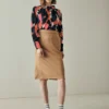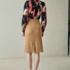 Elegant below-the-knee pencil skirt in a pleasant beige color that will be the perfect base for many of your looks this season. Closed with a side zipper and a recycled vintage button at the waistband, it’s made from an incredibly soft and comfortable fabric. Very warm, versatile, and easy to care for.