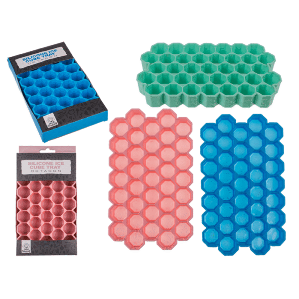 Silicone ice cube tray, Octagon, 3 colors assorted, 19,5 x 11,5 cm, for 37 ice cubes, on headercard Silicone tray