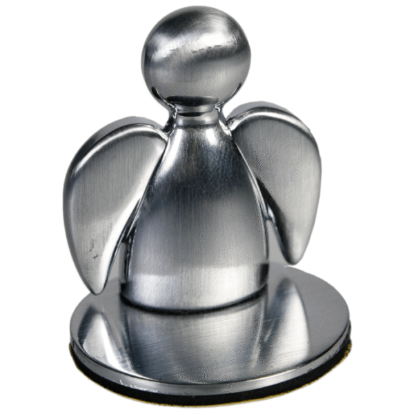 Silver-coloured Magnetic Metal Paper Holder, Guardian Angel, ca. 3 cm, on oval base with fixing sticker – This small, personal guardian angel is always with you and brings good luck! It is also particularly practical that it keeps a good eye on parking tickets, receipts and notes. The angel made of silver coloured metal magnetically holds on to the oval base. This can be attached to smooth surfaces using an adhesive pad, which is included. Guardian Angel