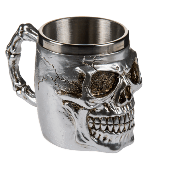 Silver plated mug with stainless steel insert, Skull, ca. 16 x 11 cm, polyresin, 2 ass. – The skull cups are the perfect accessory for your Halloween party. Also, the 3D design provides an unique drinking experience. The cups are suitable for hot and cold drinks. Machine wash is not recommended. Skull mug