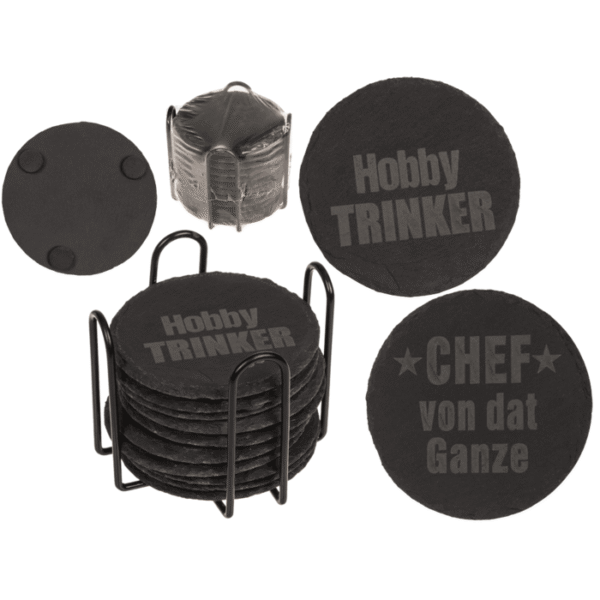 Slate coaster, with laser printing, Chef von dat Ganze & Hobbstrinker, 2 assorted, round, with EVA stopper, D: 10 cm, 12 pcs in metal stand – coaster slate laser printing drinkware