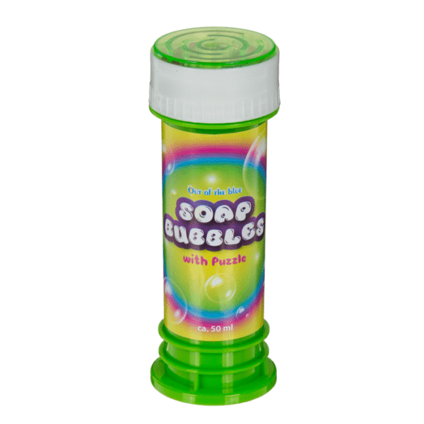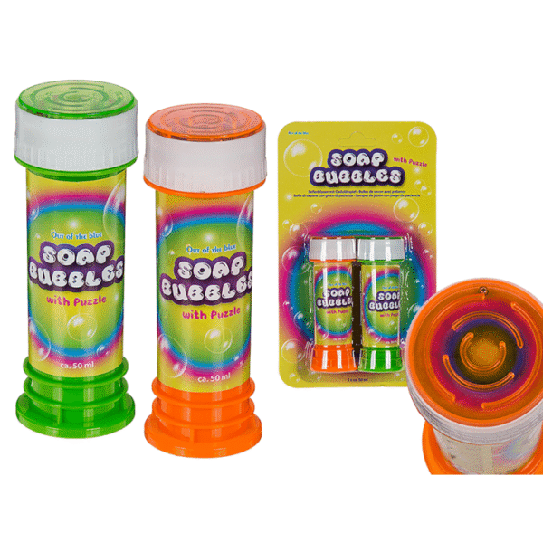 Soap bubbles with puzzle, ca. 50 ml, set of 2 on blister card – Thanks to the soap bubbles with patience game, every children’s birthday party becomes an absolute highlight. Blowing up soap bubbles is not only fun, it also requires skill. A great activity, especially for children. In addition, a patience game is integrated in the lid. You receive two soap bubble tins per blister card. Bubble Puzzle