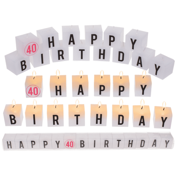 Square candles with letters, Happy 40 Birthday, ca. 3 x 3 cm, set with 14 pcs in PVC-Box – Square candles