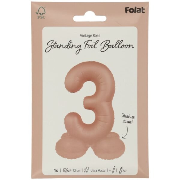 Soft in tone and strikingly festive. Standing Foil balloon Number 3 – Vintage Rose – Ultra Matt – 72 cm. Contains: 1 foil balloon. Can be used for example during the following party occasion(s): Birthday