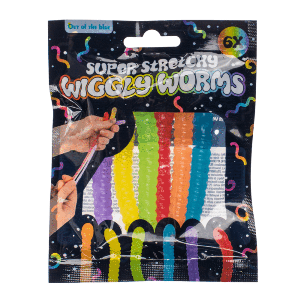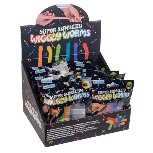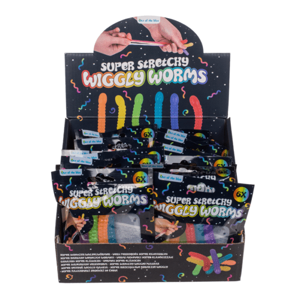 Super Stretchy Wiggly Worms, approx. 9 x 1,3 cm, set of 6 in foilbag, 24 pcs. per display Stretchy Worms