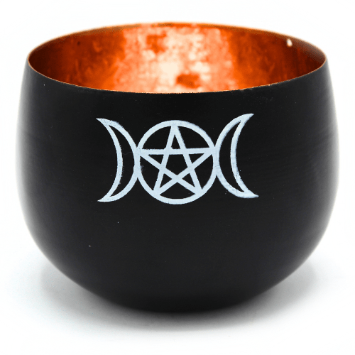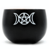 The bowl showcases a triple-moon design with a pentacle at its centre. This print combines the three-phased lunar symbol with a five-pointed star enclosed in a circle.