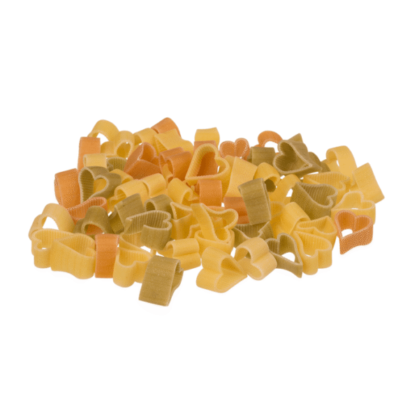 Three coloured durum wheat pasta with tomato &, spinach, Hearts, 250 g packaging with header card – Have you invited someone to dinner and you want them to have a memorable dinner? Then you need something that is not typical! Like these noodles in the shape of a heart. The little noodles are three coloured and made with spinach and tomato flavour. This makes it a breeze to impress your date! Coloured pasta