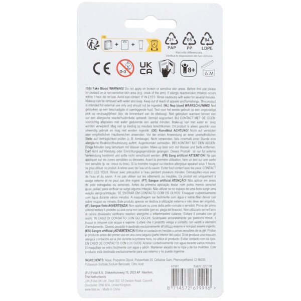 Tube Fake Blood Halloween – 28ml. Contents: 1 tube. Colour: red. You can use this article for the following party occasion(s): Halloween. There is 28 ml in a tube.