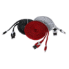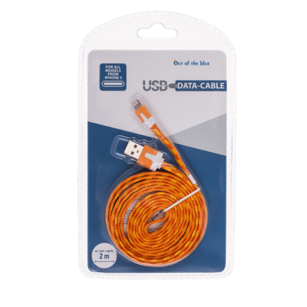 USB cable for iPhone, L: ca. 2 m, with textile jacket, 6 colours ass., in blister packaging for hanging – The robust cable ensures maximum protection, durability and flexibility that is to reduce fraying. Thanks to the length of the cable, you can move freely despite being connected. The flexible cables also do not tend to get knotted. The charging cable is compatible with iPhones. iPhone cable