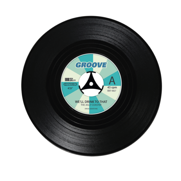 Vinyl coaster, Record, D: ca. 11 cm, 4 ass., set of 4 in packaging with header card – Skilfully showcase your coffee or other drinks with these black coloured coasters! The drink coasters in vinyl record style not only protect your table from scratches & stains, but are also a real eye-catcher at any party. Each set contains 4 of the plastic coasters. This way, you no longer have to search awkwardly for your drink at a party! Record coaster