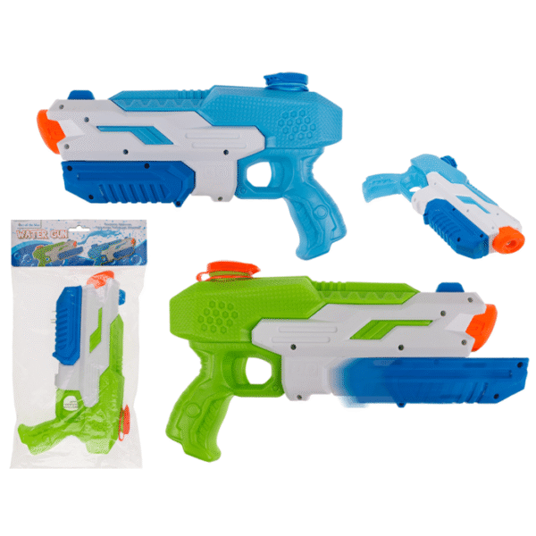 Water gun, ca. 30 cm, plastic, 2 colours ass., in polybag with header card – A summer without the colourful water pistols has been unthinkable for years! The iconic water toys are a welcome way to cool down in the hot temperatures and are also a fun gadget to tease your mates. The water pistols are guaranteed fun for the whole family. Water blaster