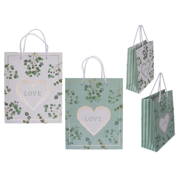 Whitegreen paper gift bag, Love, with leaf tendril, ca. 18 x 8 x 23 cm, 2 ass., 12 pcs per polybag – Gift bag
