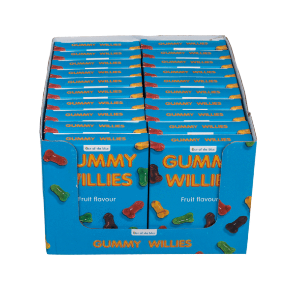 Willy gummy, ca. 100g per pack, 20 pcs. per display – The penis-shaped fruit jelly is not only a party gag, but also fruity and delicious. They can be used to decorate birthday tables, fancy cakes, muffins or anything else. The delicious gummy penises are the perfect snack for the bachelor party! Adult candy