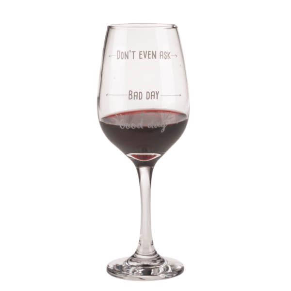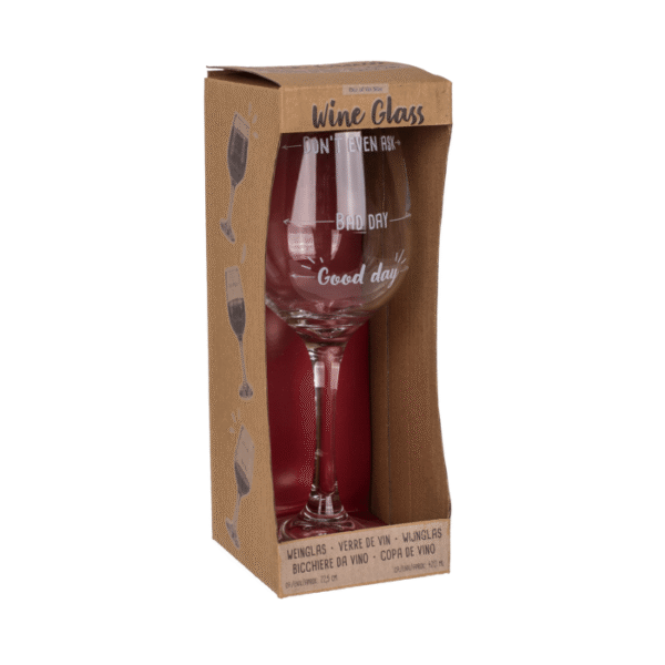 Wine glass, Good day, Bad day, Don’t even ask, for ca. 420 ml, ca. 22, 5 cm, in craft paper giftbox – With this wine glass, you can communicate your current mood to those around you without having to speak. Depending on how full the glass is, the person in front of you can read how you are feeling. Practical and reassuring at the same time! The glass has a capacity of approx. 420 ml and is perfect for a glass of wine in the evening. Stemware