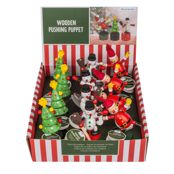 Wooden Pushing Puppet, Christmas, approx. 4,6 x 11 cm, 3 asstd., 12 pcs p. display – The colourful figurine makes a decorative addition and awakens every collector’s passion. Simply press under the pedestal and new and fun movements are created again and again. Made from robust, high-quality wood for long-lasting fun. The pushing puppet with Christmas design educates the child’s motor skills in a playful way. Wooden Puppet