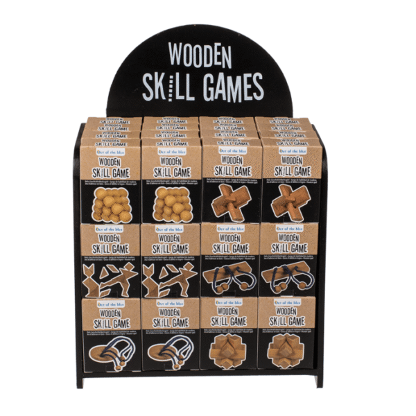 Wooden skill game, Puzzle, ca. 4,5 x 4,5 cm, 6 ass., 48 pcs. per display – The tricky game that makes heads spin! The wooden puzzles are a must for everyone who likes puzzles and brain teasers! They are perfect for long journeys and are easy to store and transport thanks to their compact size. Should a puzzle be too difficult, you will find instructions on how to solve it on the back of the packaging. Wooden puzzle
