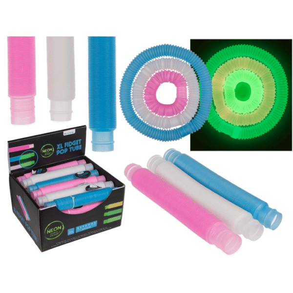 XL Fidget Pop Tube, Glow in the dark, approx. 20 cm, 3 colours ass., plastic, 24 pcs. per display Fidget Tube