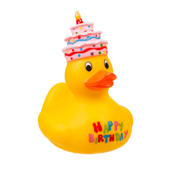 Yellow squeaking duck, Happy Birthday, ca. 10 cm – A bathroom is simply unthinkable without at least one squeaking duck and it’s even better when it’s perfectly matched to your birthday! The cult item for the bathtub in iconic yellow is approx. 8 cm and is decorated with a real looking cake and the words “Happy Birthday” and will take many a collector’s heart by storm! Yellow duck